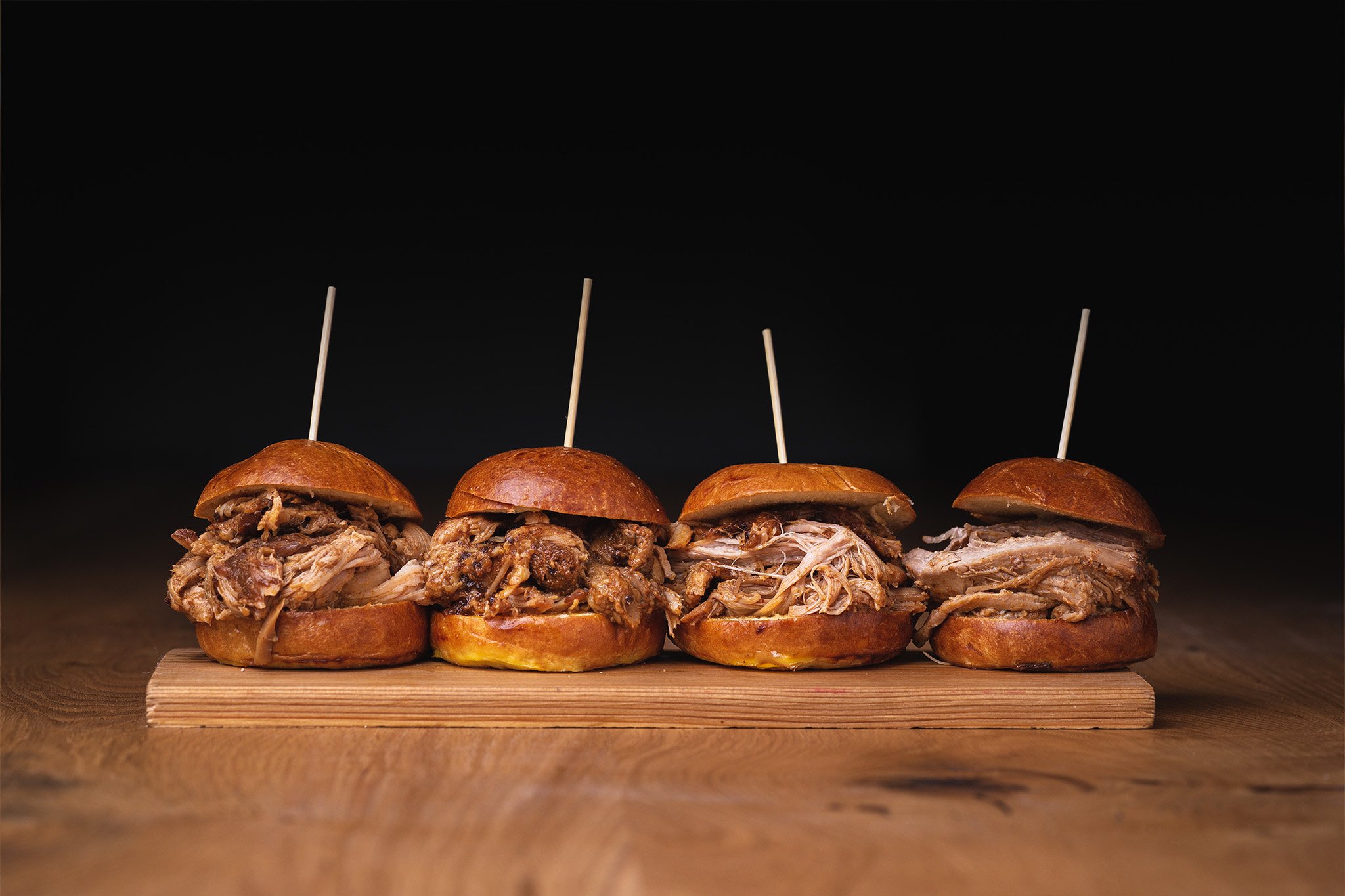 Sliders & Glizzies — $20 per person (10-person minimum): A trio of sliders and wagyu beef franks. Features wagyu beef franks with classic Chicago-style fixings, plus brisket, pulled pork, and pulled chicken sliders. Served with coleslaw and pickles.