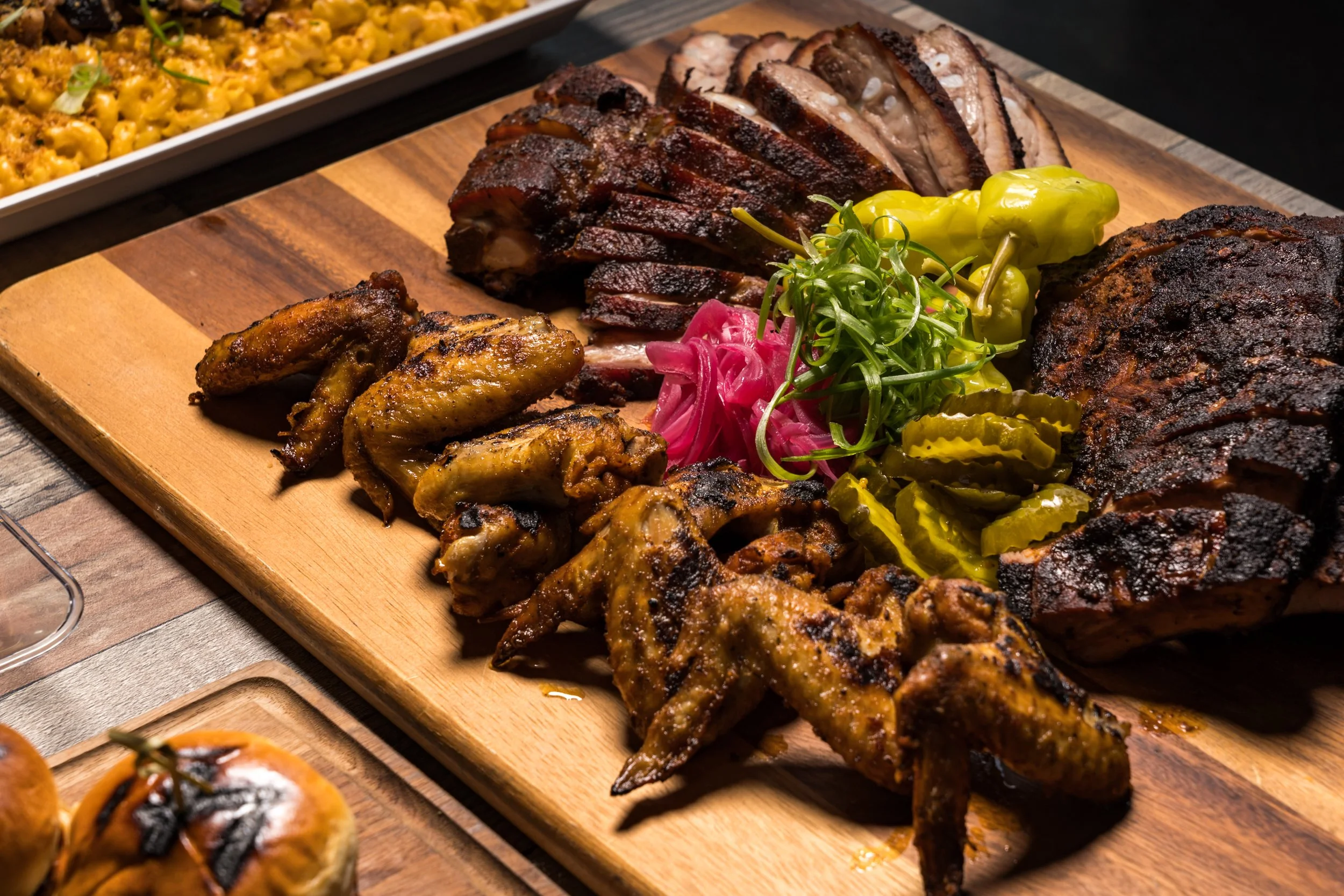 Ribs, Tips & Wings — $25 per person: Full slabs of smoked spare ribs, rib tips, and chicken wings, served with sweet, spicy, and Caribbean BBQ sauces.